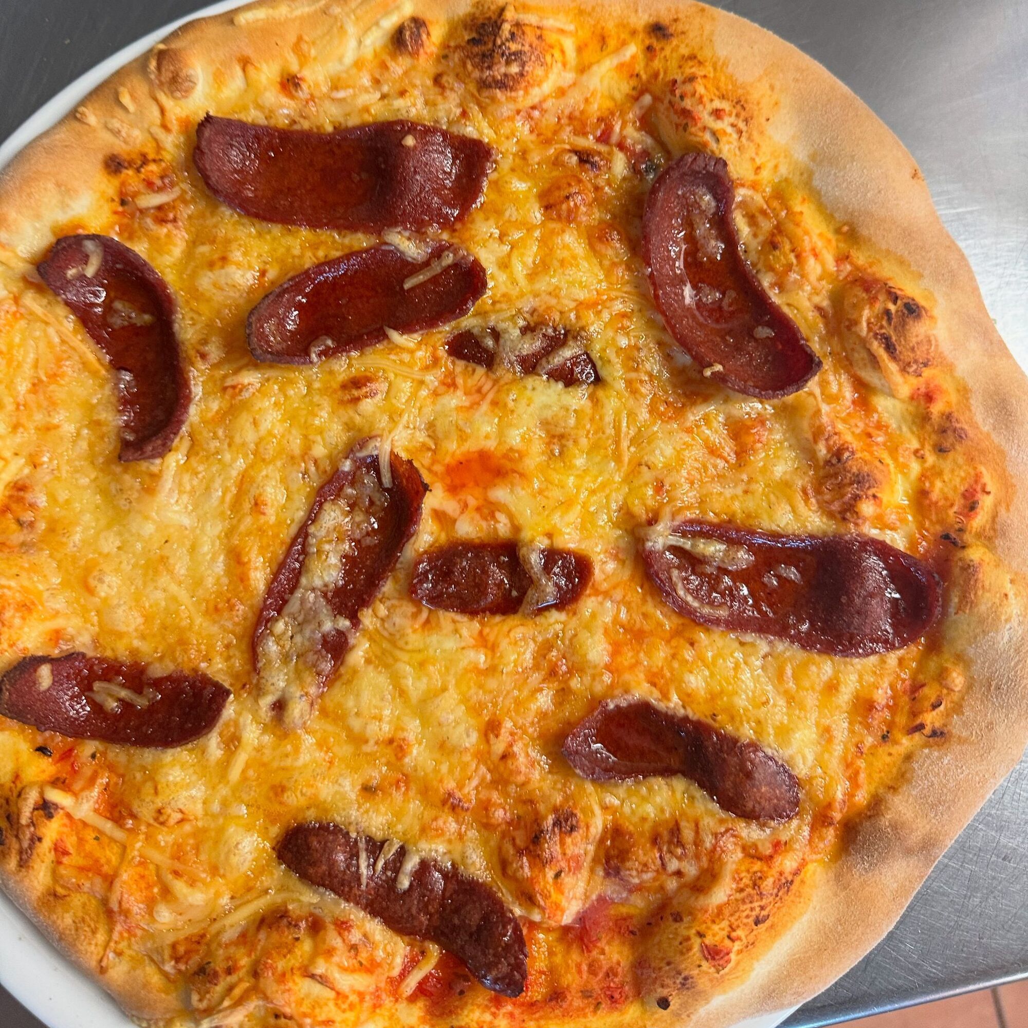 Met onze tomatensaus, kaas en salami