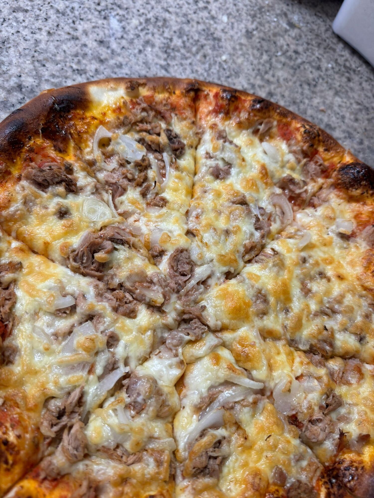 Met onze tomatensaus, kaas en tonijn